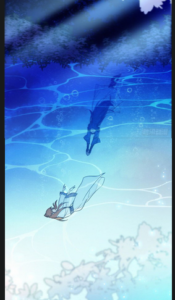 Pour satisfaire les besoins de « sauvetage de princesses en détresse », les héroïnes doivent souvent… presque se noyer en trébuchant dans de l’eau, ici un lac. Deux incohérences constantes : de nos jour, tous les jeunes savent nager (au moins assez pour flotter quelques secondes) et non les bords de lac n’ont pas de parois abruptes dignes d’un grand canyon : il y a pied sur plusieurs mètres. Sur l’illustration ici, on voit qu’il y a bien 5 fois la hauteur d’une personne, soit plus de 8 mètres…