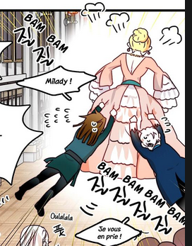Force surhumaine dont peuvent faire preuve les femmes en colère ! Celle-ci reste inarrêtable malgré les deux servants qui essayer de la stopper, suspendus à ses jupes mais arrivant tout juste à la freiner !