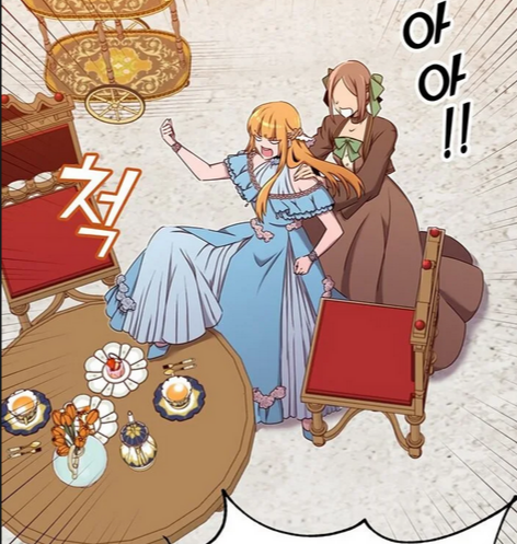 Femme énergique animée d’un esprit combatif qui exprime avec force son motivation, un pied sur la table et le point en l’air, alors qu’une de ses amie de la partie de thé essaye de calmer son excès de zèle.