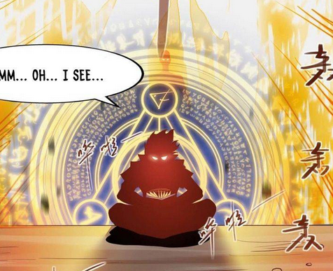 Le gars, surpuissant et qui fait peur avec ses yeux allumées, est surper concentré, plongé dans sa lecture et réfléchissant aux contenu et à ses implications, comme le prouve les cercles magiques qui s’activent en arrière plan.