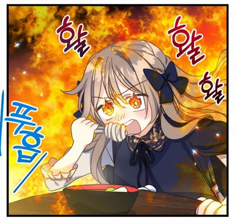 Un appétit d’ogre ? Non ! Une faim dévorante d’une personne affamée ! La jeune fille mange avec un enthousiasme brûlant, des flammes dans les yeux, derrière elle et tout autour d’elle ! Gare à quiconque voudrait lui piquer sa nourriture !
