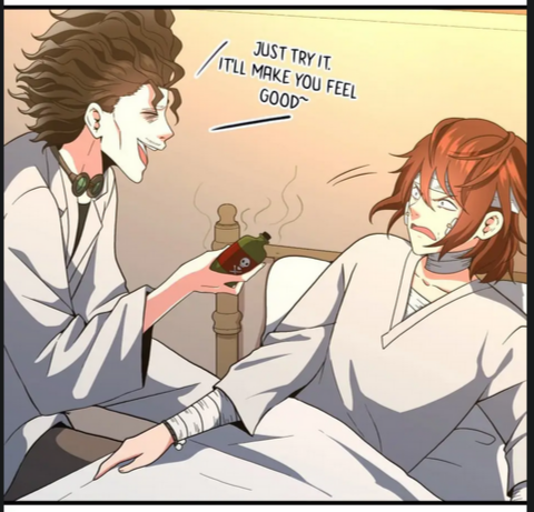 Le scientifique fou, le visage pâle et les yeux assombris par des cernes, propose un flacon au contenu mortel au blessé alité à l’infirmerie.
