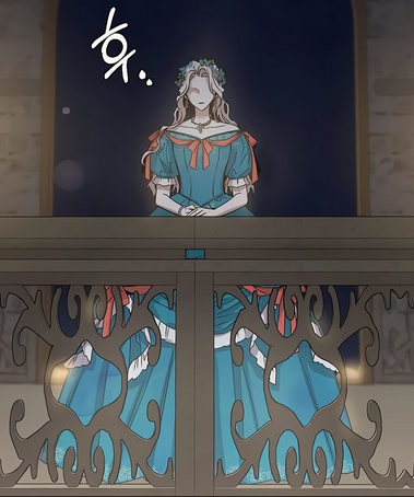 Une jeune royale blonde surplombant la foule avec couronne végétale dans les cheveux, accoudée à un majestueux balcon sculpté en bois et portant une longue robe bleue.