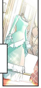 Robe vert d’eau à franges blanches exposé sur mannequin dans salon.
