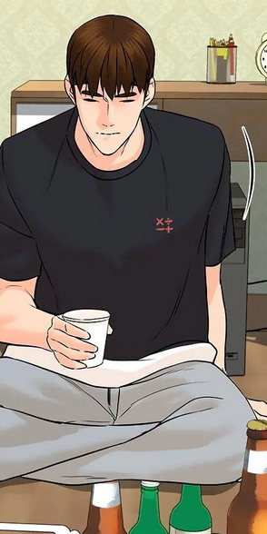 Même manga, même chapitre, même beuverie, même sommets de bouteilles (premier plan) cachées derrières les jambes du gras assis au second plan…