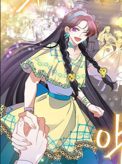 Tenue today-the-villainess-has-fun-again Image d’une héroïne souriante en robe jaune et bleue ave des fleurs dans ses cheveux longs.
