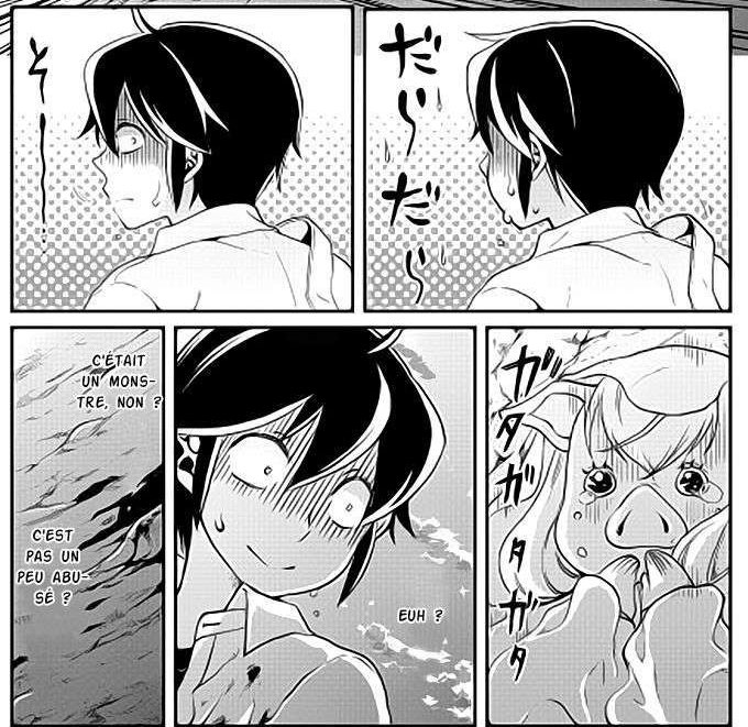 Terreur derrière Tsuki ga Michibiku Isekai Douchuu Le jeune homme, autant mal à l’aise que terrifié, se retourne lentement…